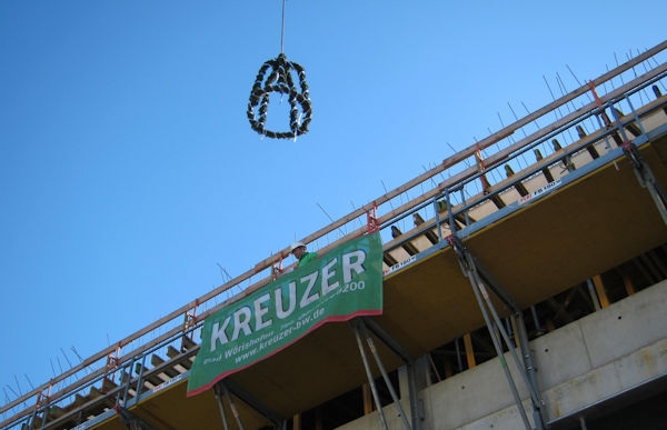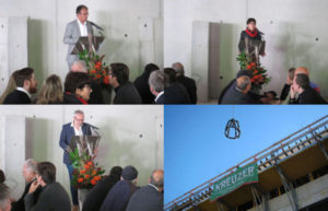 Landrat Karmasin, als Vertreter des Bauherrn, hielt die Eröffnungsrede. Kurz und prägnant stellte er fest, dass dies eine beispielhafte Baustelle sei. Von den bewilligten 44,11 Millionen Euro sind bisher 25 Millionen Euro verbraucht, was dem Rahmen entspricht. Mit dem heutigen Tag ist der Zeitplan Tag genau eingehalten. Bisher sind glücklicherweise auch keine Unfälle auf der Baustelle zu verzeichnen. Die Feierlichkeit wurden von einer Blaskappele, wobei drei Musiker Mitarbeiter des Landratsamtes sind, umrahmt.