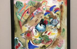 Zuerst bekommt jeder ein Namensschild. Dann zwei Schlagstöcke, mit denen alle Vornamen der Reihe nach auf den Sitzwürfeln getrommelt werden sollen. Nach diesem ersten Warm-up geht es in den ersten Stock zu einem Gemälde von Wassily Kandinsky aus dem Jahr 1913 mit dem Titel „Träumerische Improvisation“. Hier schaffen es die beiden Leiter des Workshops, dass wir Kandinsky hören und selbst anfangen mit DIN A4 Papier Töne und Klänge zu produzieren.