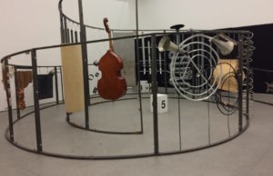 Wieder zurück in den Workshop-Räumen erleben wir in einer raumfüllenden Klangschnecke, wie man aus Servierschalen, Feilen in unterschiedlichen Längen, Spachteln in verschiedenen Größen, Metallplatten, kreuz und quer gespannten Saiten, Holzzylindern und vielem mehr Klänge hervorzaubert. Dann sind da noch Schläuche mit Metallkappen und trichterförmigen Endstücken, aus denen allerdings kaum einer einen Ton herauslocken kann.