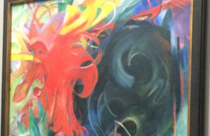 Zunächst probieren wir alles ausgiebig aus, bevor wir die Aufgabe bekommen, ein Gemälde von Franz Marc mit dem Titel „Kämpfende Formen“ aus dem Jahr 1914 zu vertonen. Der Kampf Rot gegen Schwarz mit einer Fülle an bunten Zuschauern im Hintergrund. Inspiriert von all den bisherigen Eindrücken machen wir uns ohne weiteres und hochkonzentriert in Dreiergruppen an die Arbeit und komponieren Stücke, jedes überraschend anders und jedes voll Intensität. Zuletzt gibt es natürlich auch eine Performance. Jede Gruppe trägt ihre Komposition vor. Tatsächlich können wir hören, wer Schwarz, wer Rot und wer den Hintergrund vertont. Beeindruckend.