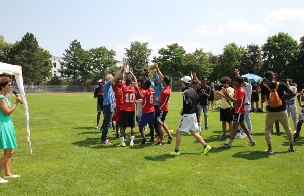 Dann humpelt eine Spielerin ins Zelt und die Sonnencreme ist erst einmal vergessen. Ihr Knie ist angeschwollen und es muss mit Eis gekühlt werden. Auf meine Frage hin, ob sie mit einem Fußballer zusammengestoßen ist, winkt sie ab und meint: „Man muss zwar auf den Herrn Vögerl und den Herrn Fuchs aufpassen, wenn man gegen das Lehrerteam spielt, aber das mit dem Knie bin ich gewohnt. Das schwillt oft an, wenn ich Fußball spiele.“ Ich will ihr gerade noch raten, es ein bisschen hoch zu legen, da lässt sie den Coolpack fallen und läuft zurück aufs Spielfeld. Ihr Team, die „Sportsfreunde Auer“, treten im Halbfinale gegen die BI10do an. Dass wir schon so weit sind, habe ich gar nicht mitbekommen. Auf dem gegenüberliegenden Feld messen sich im zweiten Halbfinale die Lehrer mit der Flüchtlingsklasse BI11m und unterliegen knapp mit 0:1.