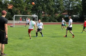 Etwas verspätet pfeifen die Schiris die Spiele an und dann geht es auch schon los. Da kicken lustige Teams wie die „Spitzkopflarrys“ gegen die „Class on Grass“ und die „Leoparden“ liefern sich ein hitziges Duell mit den „Sportsfreunden Auer“. Im Acht-Minuten-Takt wechseln sich die Mannschaften ab und es wird kein bisschen langweilig. Nicht zuletzt, weil Nico H. und Vincent B. aus der E 11a als DJs für genau die richtige Musik im Hintergrund sorgen. Zumindest finde ich das, denn ein paar Mädels wollen schon nach wenigen Minuten die beiden Jungs überreden, die rockige Musik von Metallica gegen eine Playlist auf ihren Handys einzutauschen. Aber man(n) ist ja kompromissbereit 😉