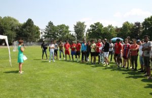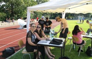 In der Zwischenzeit machen die Moderatorinnen Stefanie W. und Johanna S. aus der WS10b mit viel Humor eine Wettervorhersage für den restlichen Tag. Sonnig und sehr heiß soll es bleiben. Meine Schülerinnen im Erste-Hilfe-Zelt kommen auf die Idee, großzügig Sonnencreme zu verteilen. Ein guter Plan, jedoch stehen jetzt die Fußballer Schlange und ich frage mich, ob das wohl an der Sonnencreme liegt.